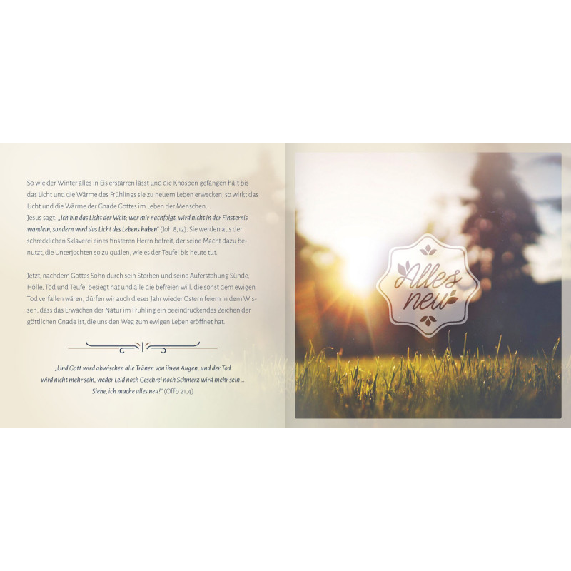 Ostern ist - wie Weihnachten - eine gute Gelegenheit, um die gute Botschaft vom Kreuz und von der Auferstehung an Außenstehende weiterzugeben. Dazu ist dieses ansprechend gestaltete Heft eine gute Möglichkeit.