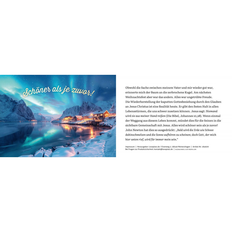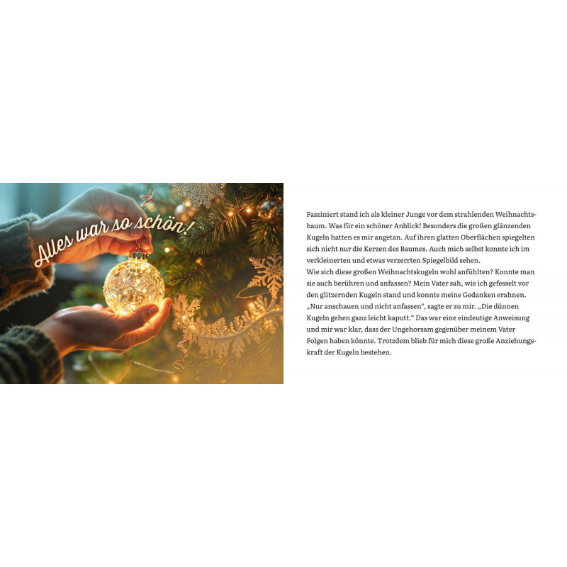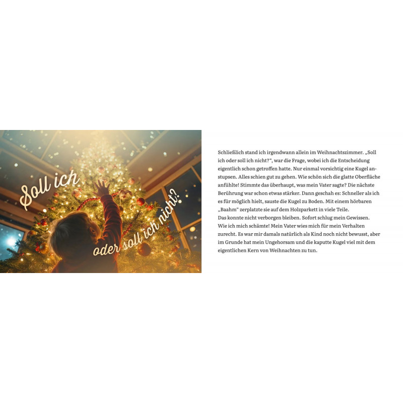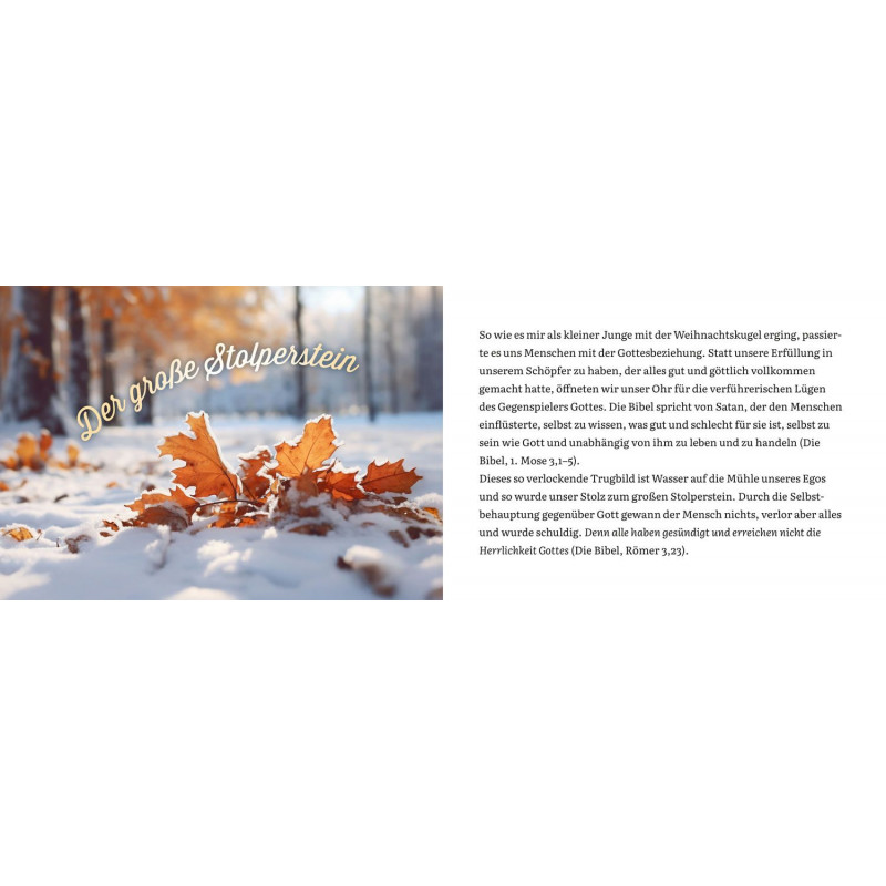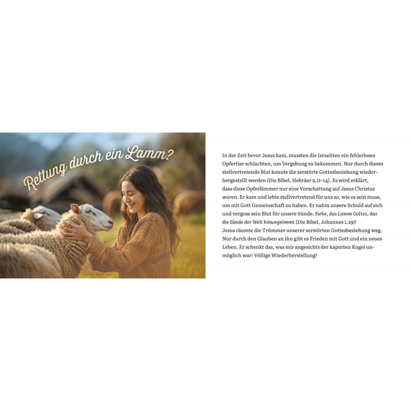 Eine kaputte Weihnachtskugel, die der Autor als Kind verbotenerweise anfasste und zerbrach, veranschaulicht die zerstörte Beziehung zwischen Menschen und Gott. Um diesen Scherbenhaufen zu beseitigen, startete Gott an Weihnachten die größte Rettungsaktion: Jesus Christus wurde Mensch, um den Totalschaden unserer Schuld zu beseitigen. Durch den Glauben an ihn gibt es Frieden mit Gott und ein neues Leben. Er schenkt das, was angesichts der Trümmer unmöglich war: völlige Wiederherstellung!