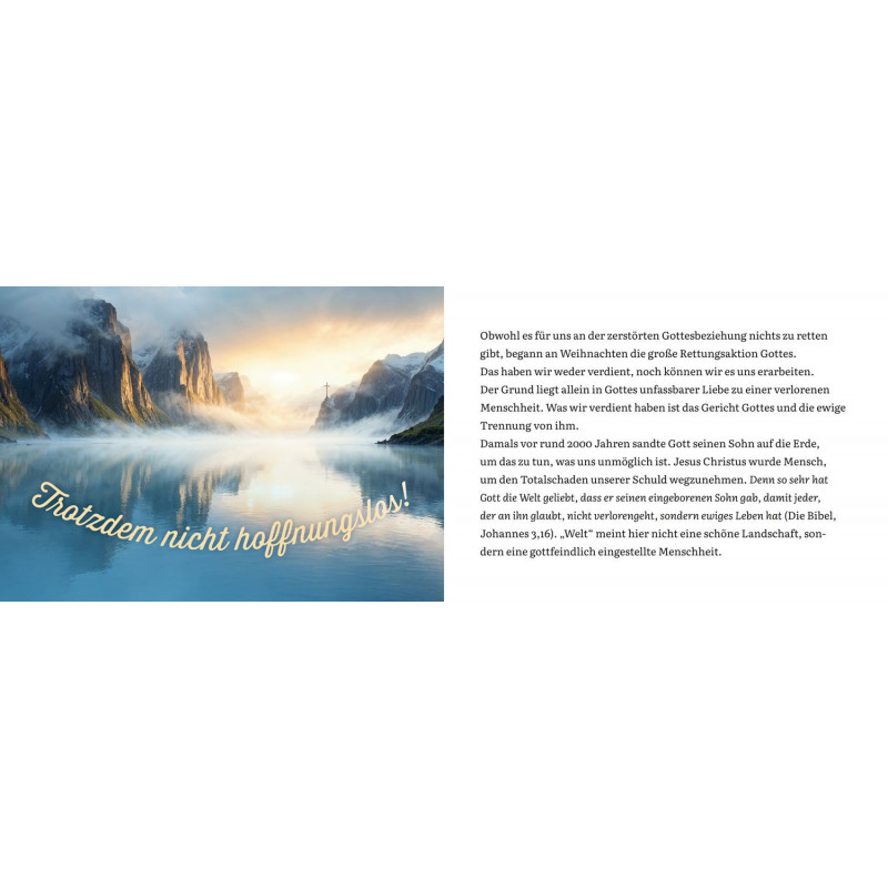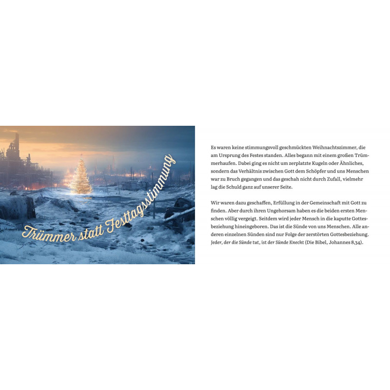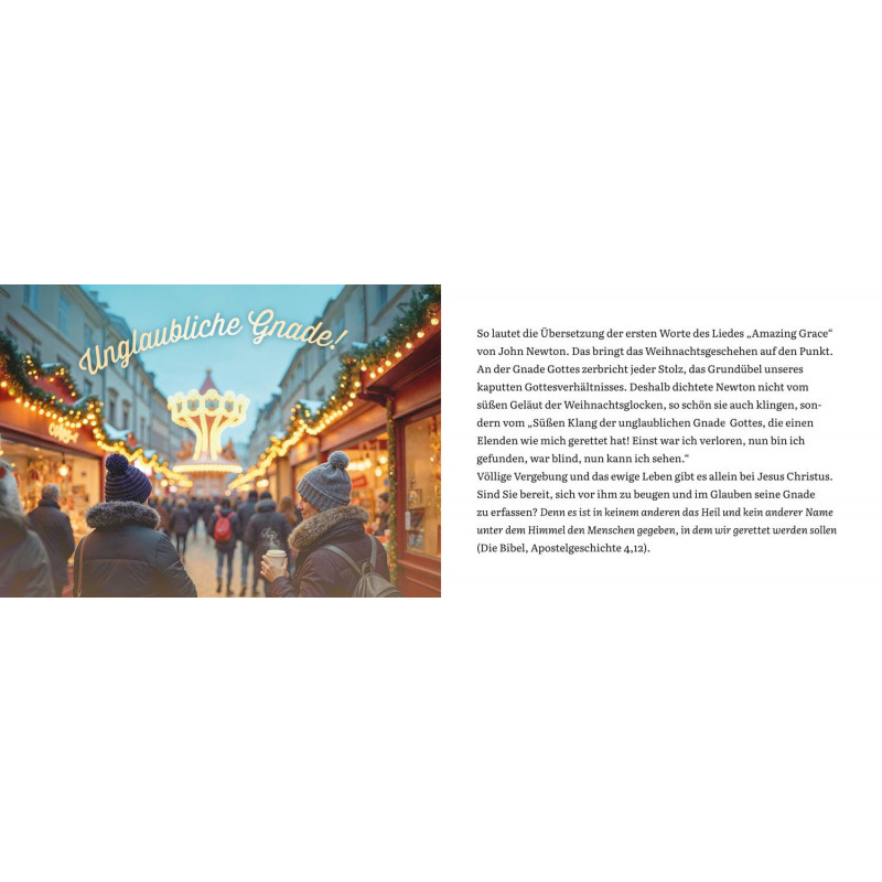 Ein ansprechend gestaltetes, evangelistisches Weihnachts-Verteilheft. Sehr gut geeignet, um es in der Nachbarschaft zu verteilen, im Bekanntenkreis, am Arbeitsplatz, auf Weihnachtsmärkten oder als wegweisende Beigabe zu einem Geschenk.