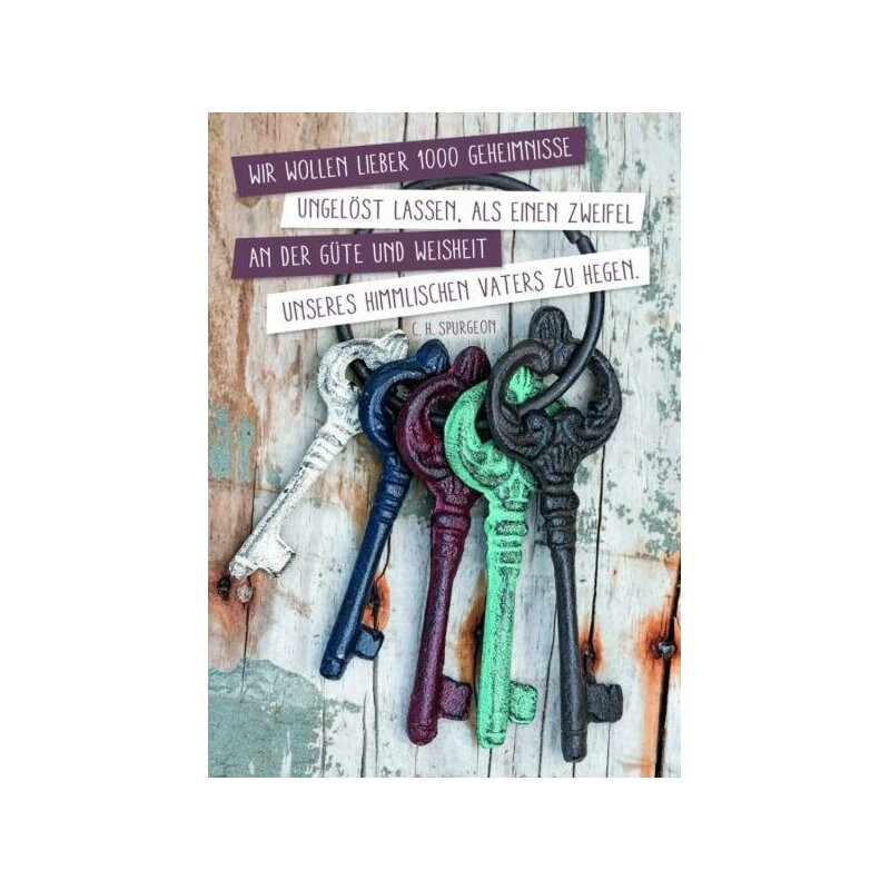 Postkarte mit dem Aufdruck: Wir wollen lieber 1000 Geheimnisse ungelöst lassen, als einen Zweifel an der Güte und Weisheit unseres himmlischen Vaters zu hegen. C.H. Spurgeon