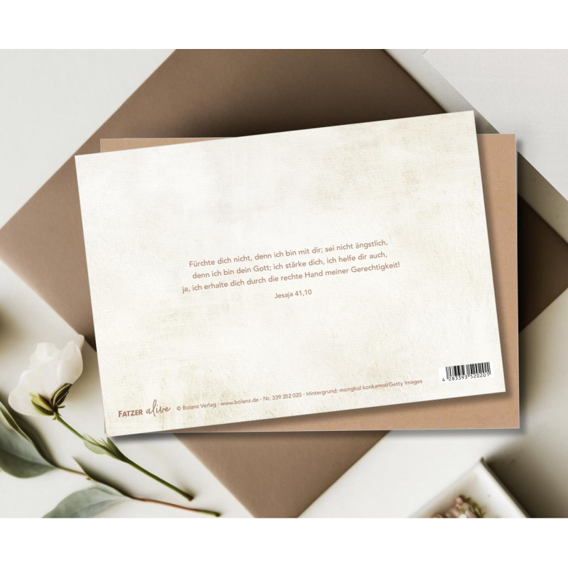 Aufdruck hinten: Fürchte dich nicht, denn ich bin mit dir; sei nicht ängstlich, denn ich bin dein Gott; ich stärke dich, ich helfe dir auch, ja, ich erhalte dich durch die rechte Hand meiner Gerechtigkeit! Jesaja 41,10