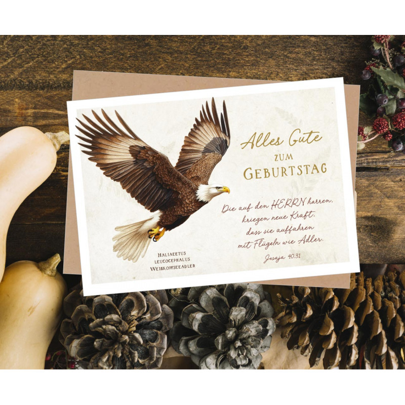Aufdruck vorne: Alles Gute zum Geburtstag - Die auf den HERRN harren, kriegen neue Kraft, dass sie auffahren mit Flügeln wie Adler. Jesaja 40,31