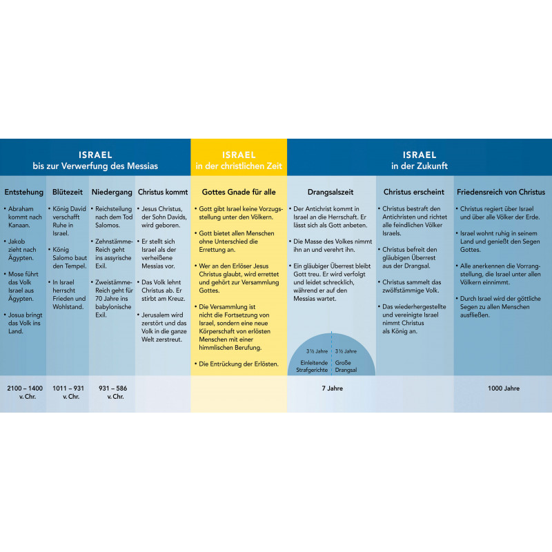 Dieses Heft iat auf der Grundlage von Vorträgen von Arend Remmers entstanden. Die Geschichte Israels wird von seiner Entstehung bis zur Verwerfung des verheissenen Königs skizziert, dann wird die Frage nach Israel in der christlichen Zeit beantwortet, um am Ende einen Blick auf die Zukunft Israels zu werfen. Viele Bibelzitate und eine am Umschlag angehängte ausklappbare Übersicht helfen dem Leser das Thema besser zu erfassen.