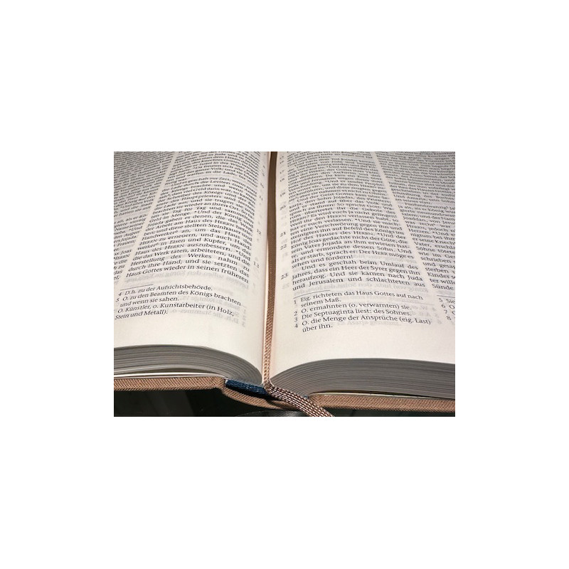 Die Bibel verfügt über ein ausgezeichnetes zweispaltiges Schriftbild. Im Anhang befinden sich Worterklärungen, Maße/Gewichte, Tabellen und farbige Karten.