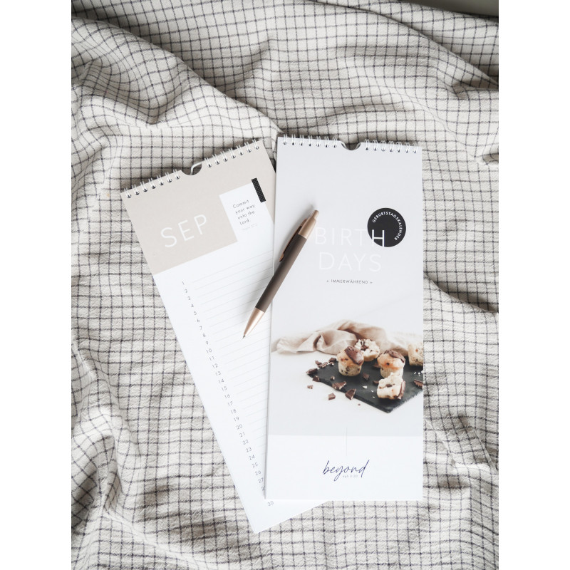 Moderner Geburtstagskalender mit Ringspirale und Aufhänger. Jeden Monat begleitet ein englischer Bibelvers.