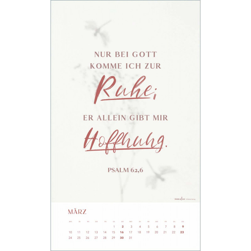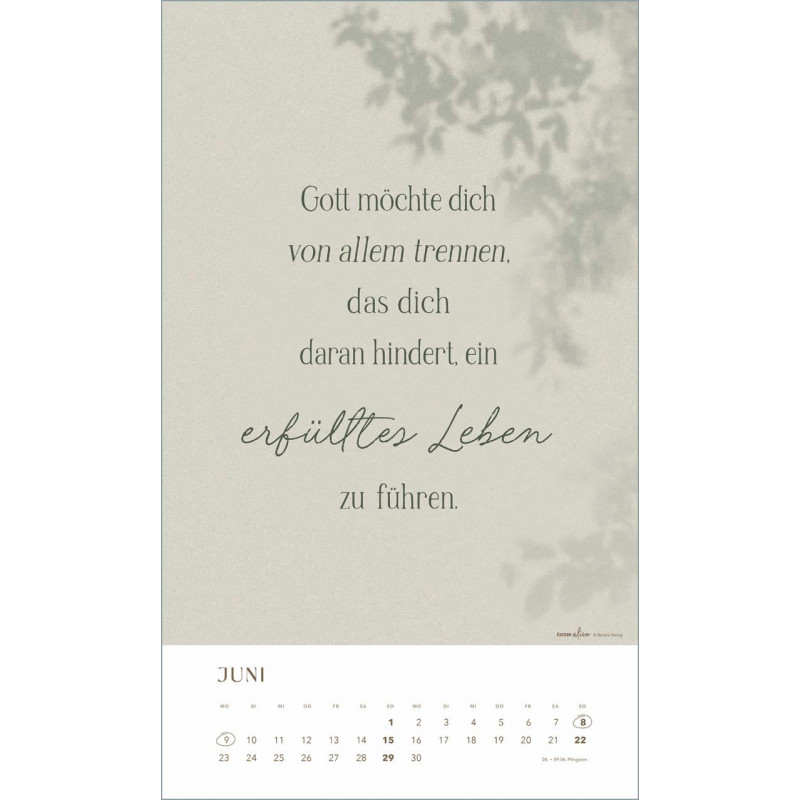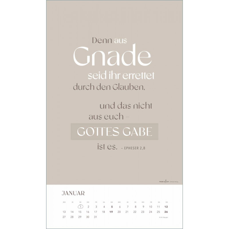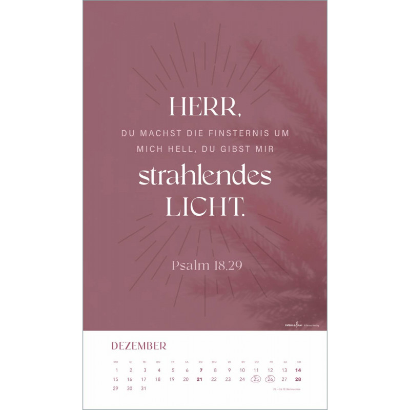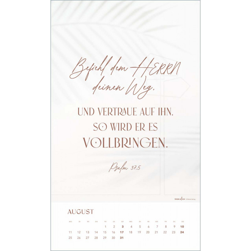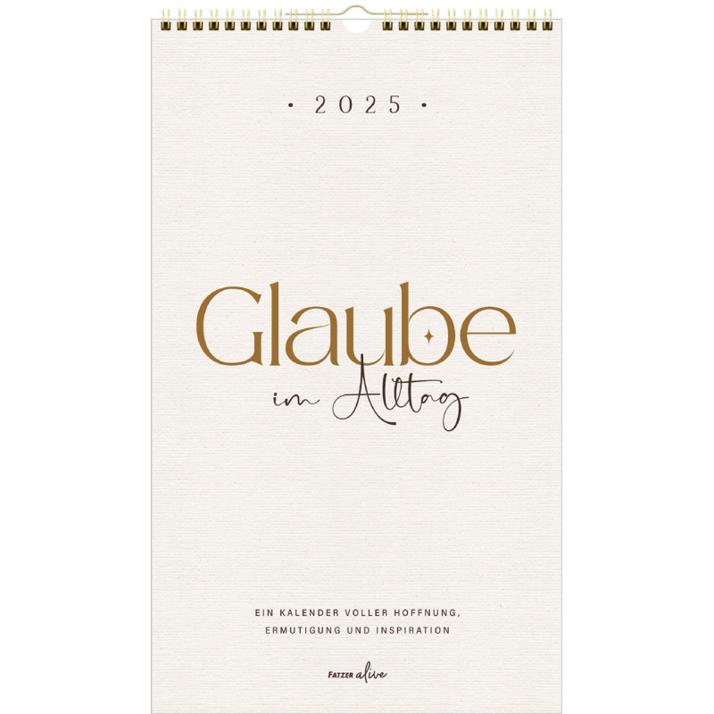 Tauche ein in die inspirierende Welt des "Glaube im Alltag" Posterkalenders! Dieser stilvolle Kalender aus der Fatzer alive Serie bietet Dir ausgewählte Bibelverse, die Hoffnung, Ermutigung und Inspiration in Dein Jahr 2025 bringen. Jedes Monatmotiv lädt dazu ein, den Glauben in den Alltag zu integrieren und die kleinen Wunder des Lebens zu entdecken.