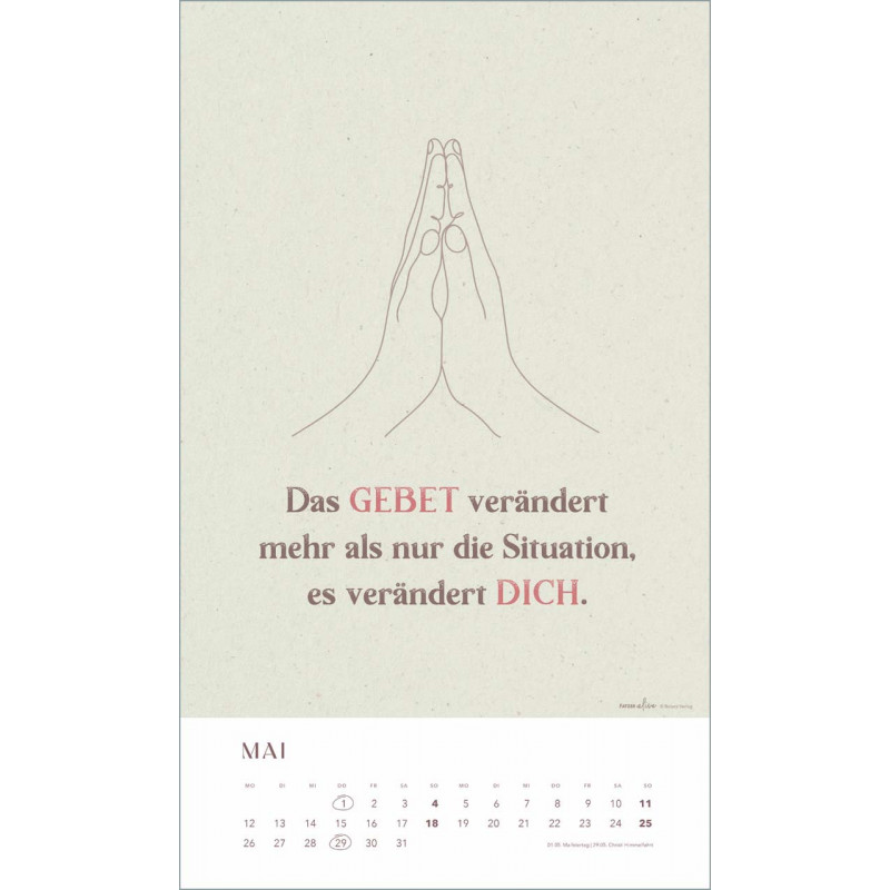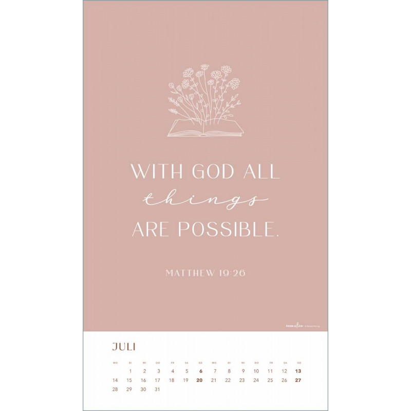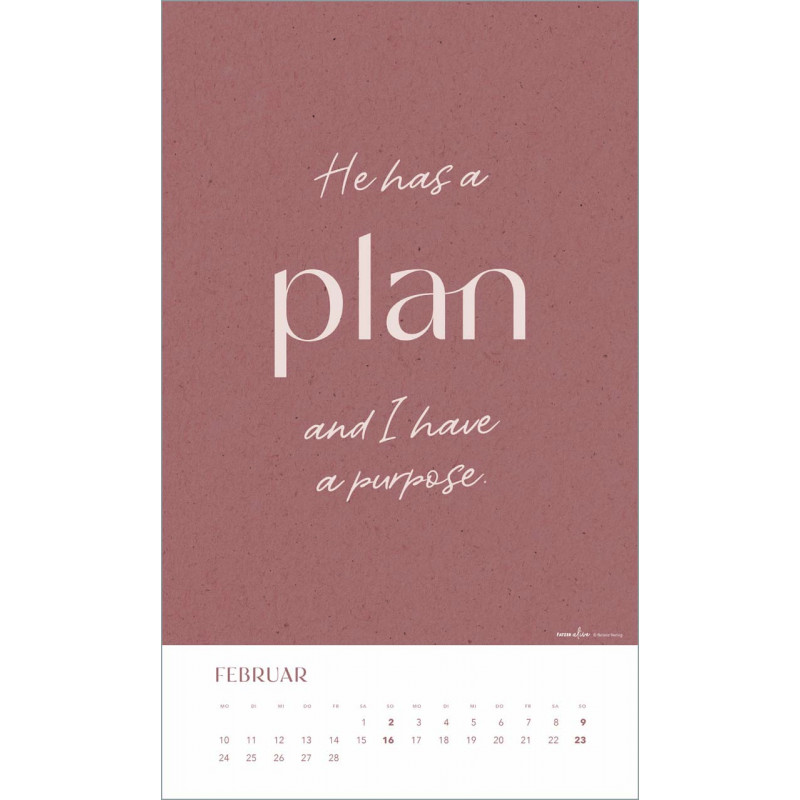 Mit einem großzügigen Format von 29 x 49 cm wird dieser Kalender zum Blickfang in Deinem Zuhause. Die Spiralbindung und der elegante Aufhängebügel in Gold verleihen ihm eine besondere Note und machen es leicht, ihn an einem Ort Deiner Wahl aufzuhängen. Lass Dich von den kraftvollen Botschaften und der ansprechenden typografischen Gestaltung begleiten, während Du das ganze Jahr über neue Kraft und Inspiration schöpfst.