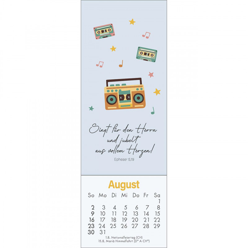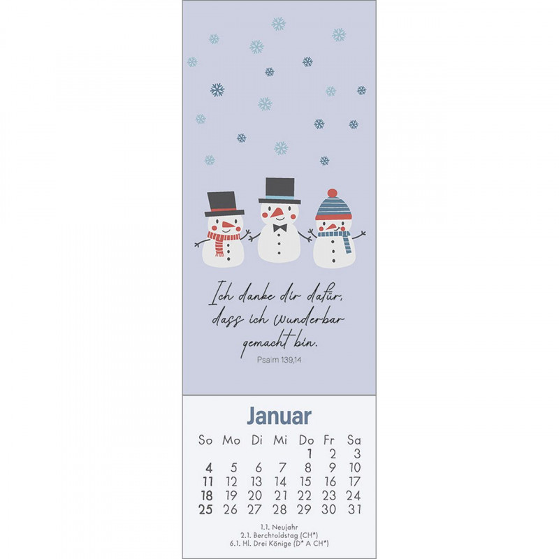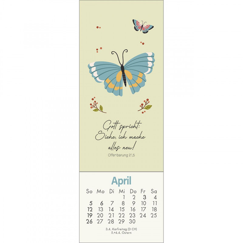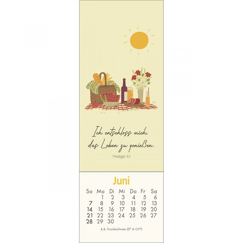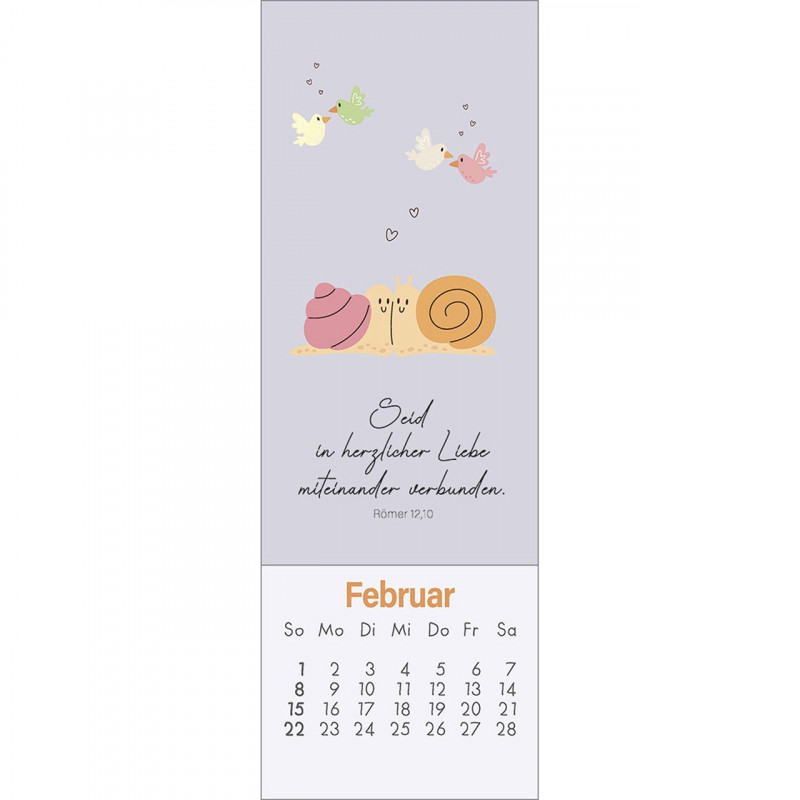 Ein liebevoll gestalteter Lesezeichenkalender, der mit ermutigenden Bibelversen und fröhlichen Grafiken für gute Laune sorgt. Ein kleiner, vielseitiger Begleiter für jeden Tag. Die 12 Monatslesezeichen lassen sich ganz einfach heraustrennen und in die Bibel oder ein Lieblingsbuch legen. So hat man nicht nur eine praktische Monatsübersicht, sondern auch ein dekoratives Lesezeichen mit einem stärkenden Bibelvers stets zur Hand.