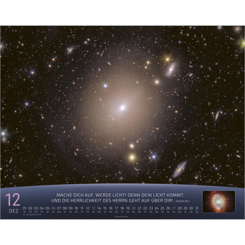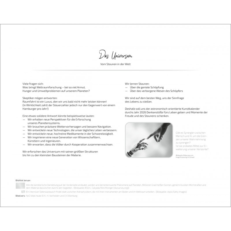 Tauche ein in die eindrucksvolle Welt des Universums mit dem Tischkalender “Du bist nicht fern: Das Universum – Ein Gedanke Gottes” für das Jahr 2026. Die faszinierenden und farbenprächtigen Aufnahmen aus den größten Teleskopen eröffnen Dir die gewaltige Dimension des Weltalls und lassen Dich staunen. Auf der Vorderseite sind dazu inspirierende Bibelverse abgedruckt, die Dich durch das Jahr begleiten.