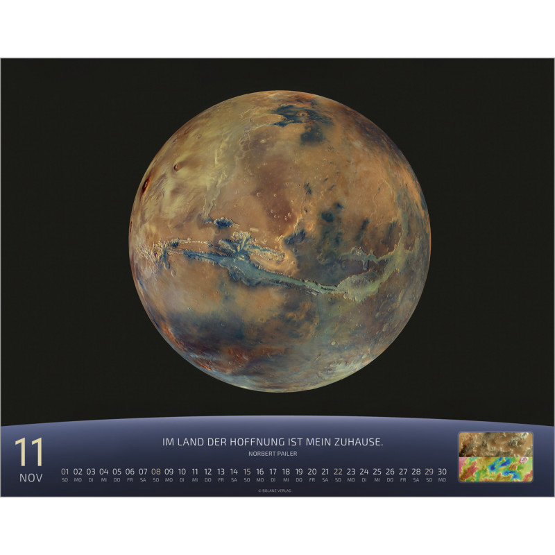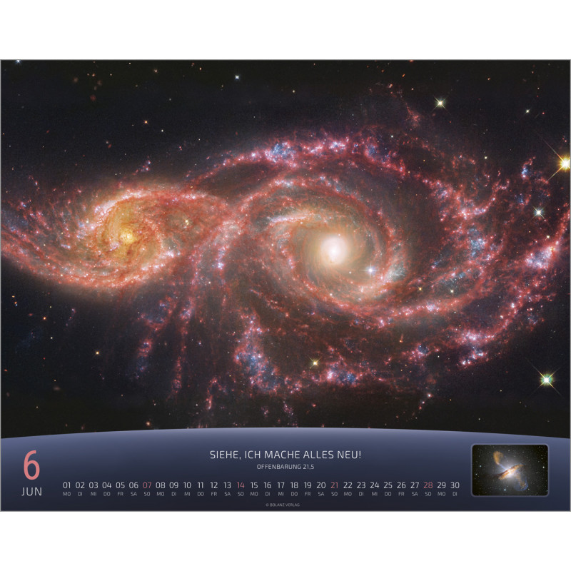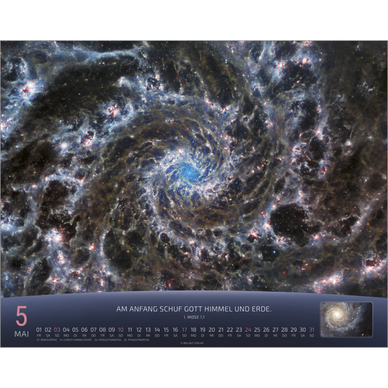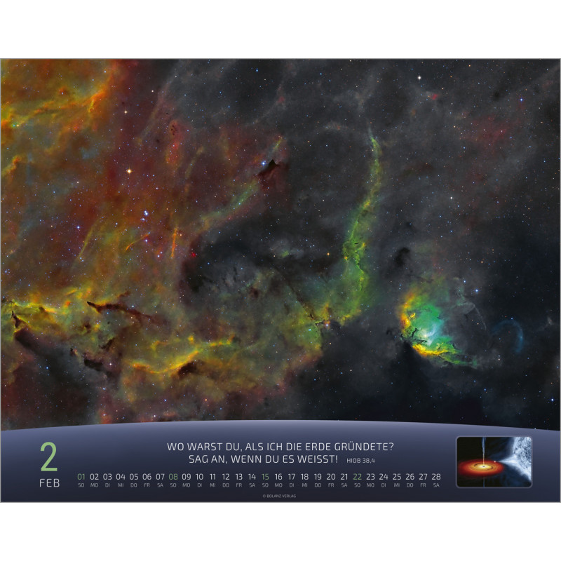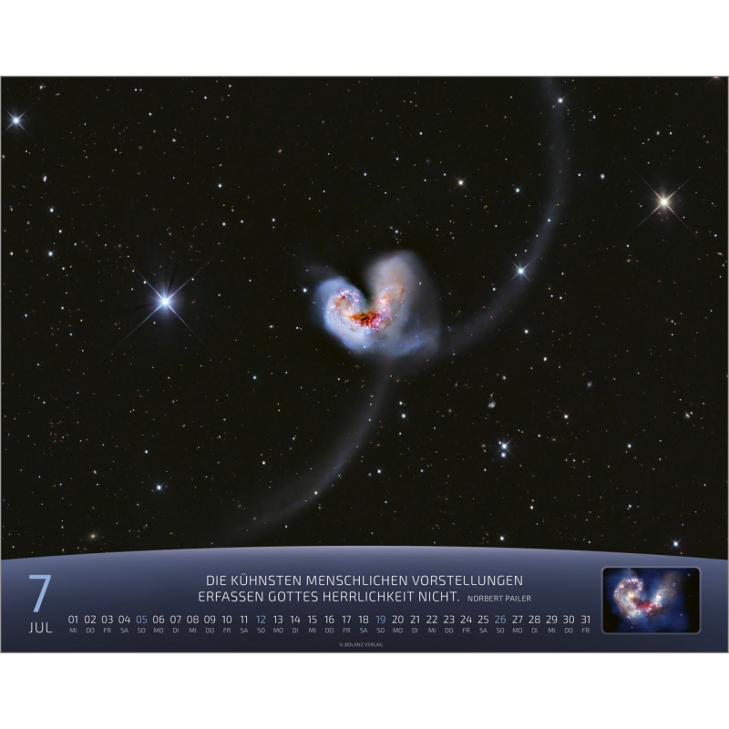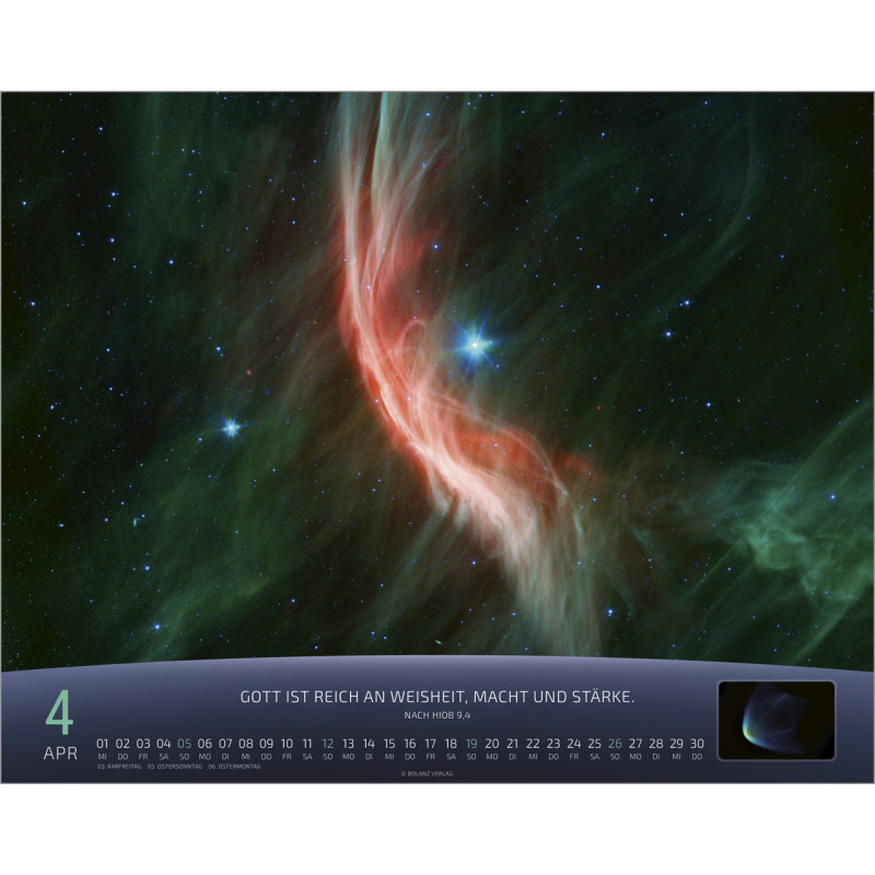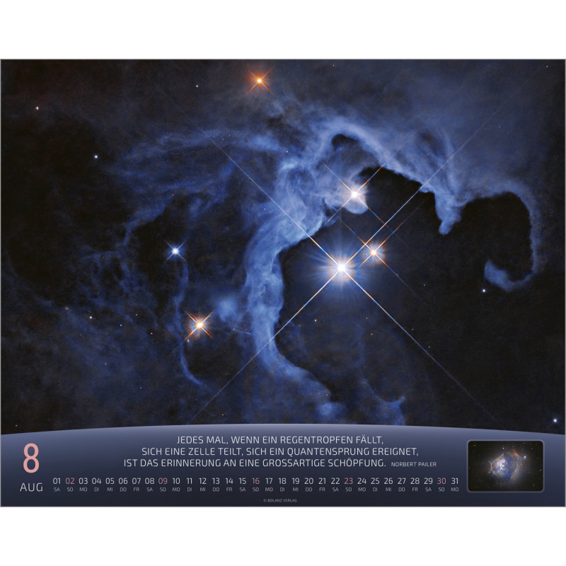Jeden Monat erwartet Dich eine atemberaubende Detailaufnahme von Sternen und Szenen aus der Raumfahrt, die die unendliche Weite des Universums zeigen. Der Kalender ist nicht nur ein optisches Highlight, sondern auch ein praktischer Begleiter für Dein Jahr. Auf der Rückseite findest Du ein Kalendarium, in dem Du wichtige Notizen, Geburtstagsdaten oder Termine eintragen kannst. Zudem ist ein kurzer Spruch abgedruckt, der Dich zusätzlich inspiriert.